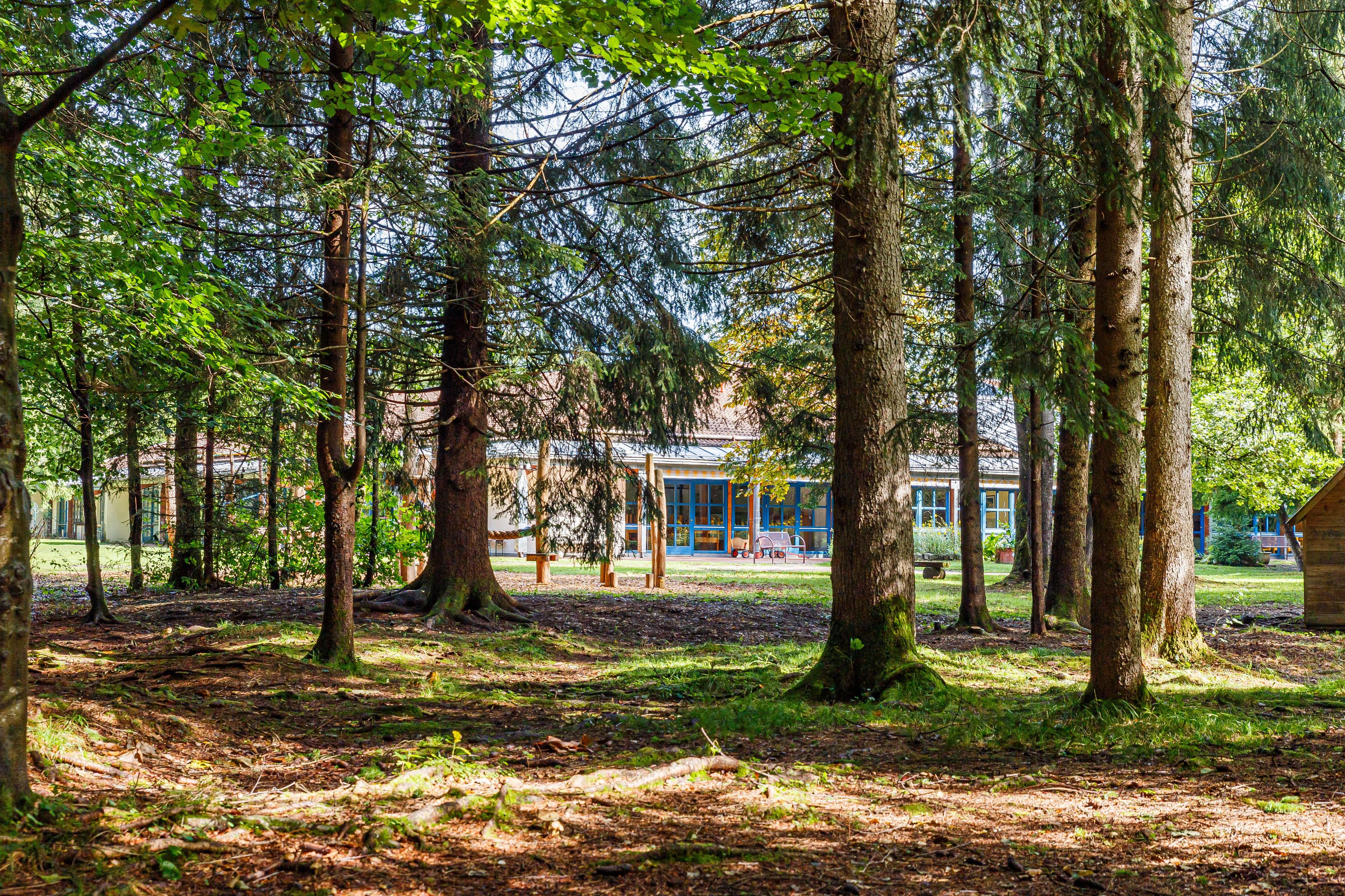 Ein großer naturbelassener Garten mit Waldbestand bietet viele Möglichkeiten zum Entdecken, Bewegen, Beobachten und Spielen.