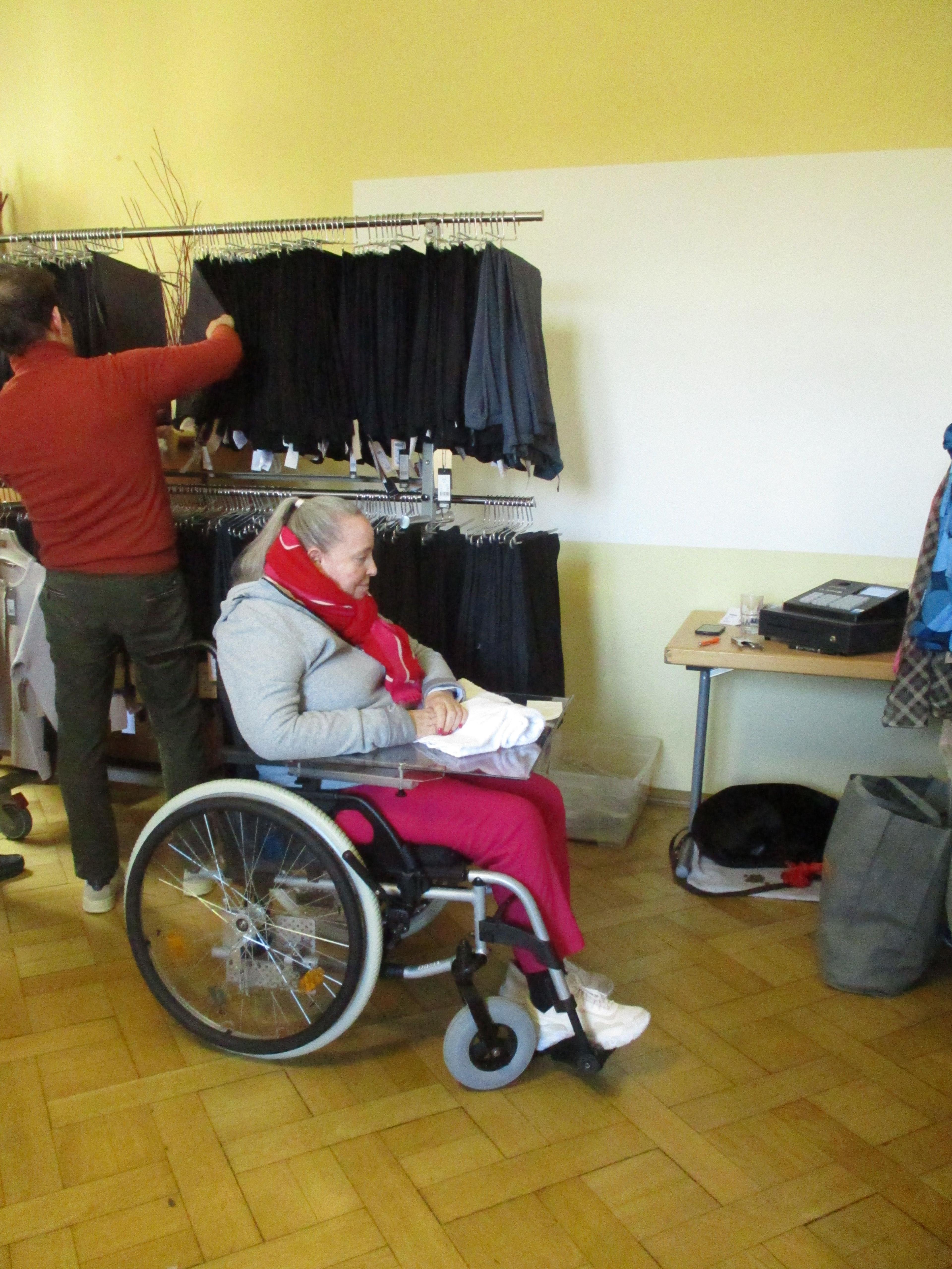 Im Mehrzweckraum hatte Er Kleidungsständer mit herbstlichen und winterlichen, aber vor allem seniorengerechten Kleidungsstücken aufgebaut.