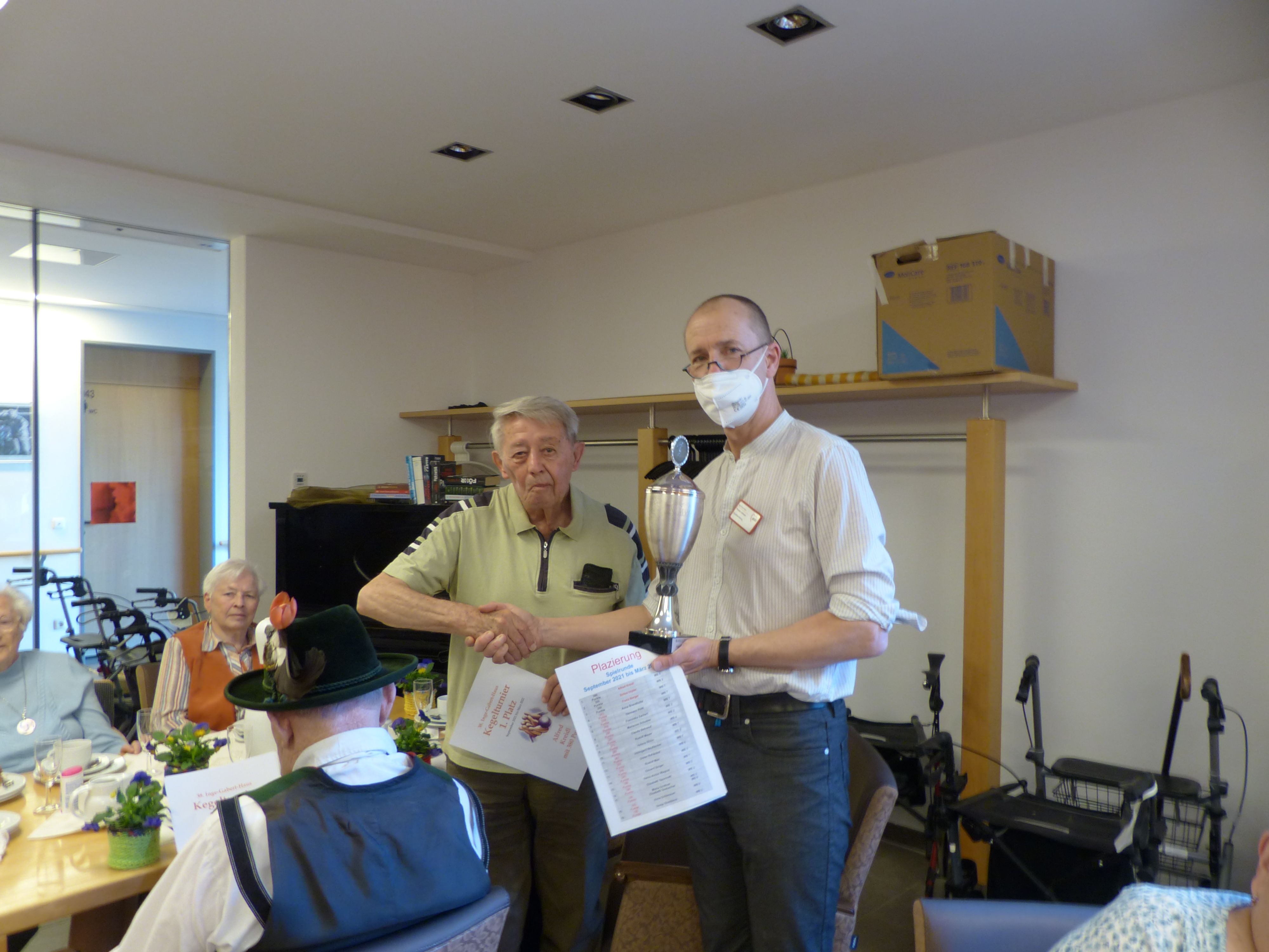 Nach zwei Jahren Pause konnte im Inge-Gabert-Haus mal wieder eine Kegelsaison abschließen. Seit vergangenen September kegelten wir im vierzehn Tage Rhythmus auf dem Wohnbereich 7 in „die Vollen“. Und wie vor der Pandemie waren alle begeisterten Kegler mit großer Leidenschaft mit dabei. Allein achtmal konnten die Kegler während der Saison eine „Kränzchen“ bejubeln und 122x räumten die Spieler alle neun Kegel vom Platz. Als sich die Kegelgemeinde am 23. März zur Siegerehrung in der Cafeteria trafen, war die Spannung recht groß. Wer wird den Wanderpokal für die nächsten sechs Monaten mit nach Hause nehmen?