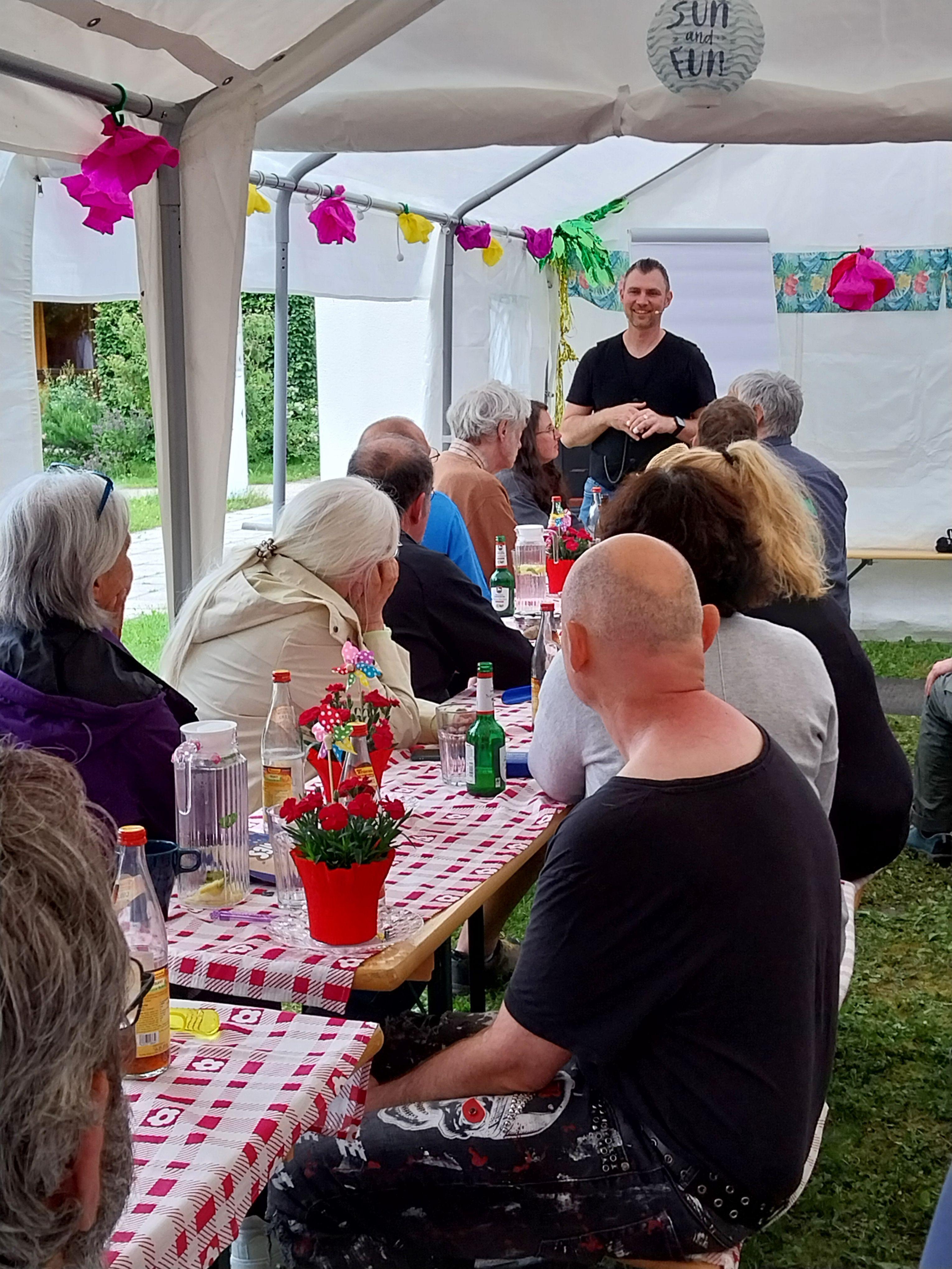 Die STE-Familie feierte im gemütlichen Rahmen ihren Zusammenhalt: Ehrenamtliche, Mitarbeiter- und Bewohner*innen aus Wohngruppen und Zuverdienst freuten sich über ein richtig entspanntes Sommerfest im AWO-Garten mit viel Sonnenschein und guter Laune. Alle Gäste folgten gerne der Einladung von Einrichtungsleiter Florian Zehentmaier und ließen es sich mit lustigen Spielen, Kaffee und Kuchen, später auch Braten und Currypfanne, so richtig gutgehen. Motto: Ankommen, dabei sein und wohlfühlen!